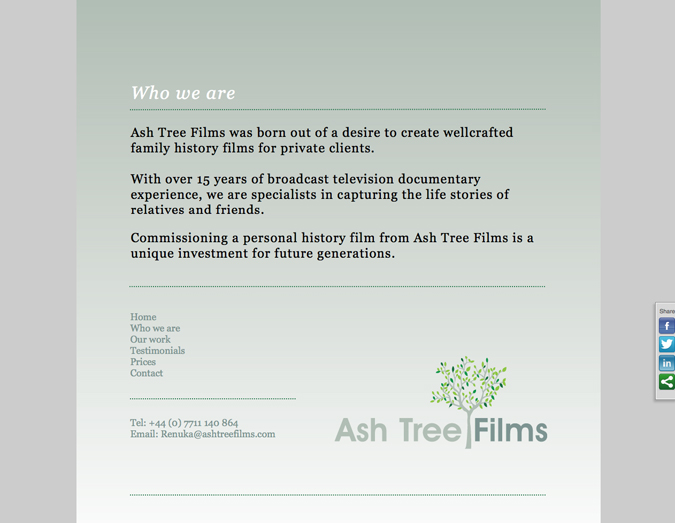 Ash Tree Films was born out of a desire to create well-crafted family history films for private clients. With over 15 years of broadcast television documentary experience, they are specialists in capturing the life stories of relatives and friends. Commissioning a personal history film from Ash Tree Films is a unique investment for future generations. I was commissioned to produce their logo and website last year.