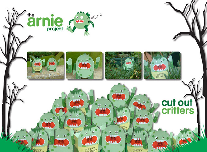 The Arnie project is based all around Arnie. What is Arnie? Nobody quite knows, is he a frog, a fish or a dragon? Perhaps even a mythical beast known only as a 'Fragon?' Whatever the answer Arnie will be brightening up dull work or shelf spaces near you. Pugilist Design will release the cut out critters in early 2009. These bespoke greeting cards will come in the form of a flat A5 sheet, which can be easily assembled with a small pair of scissors and a glue stick.